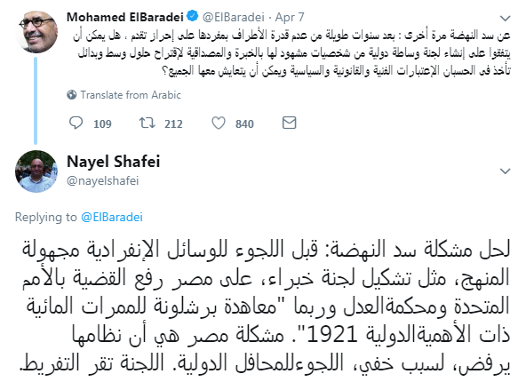دعا #محمد_البرادعي الشخصية المصرية المعروفة عالميا لعمله فترة طويلة كمدير عام للوكالة الدولية للطاقة والمعروف أيضا بعدائه للاخوان المسلمين في مصر ونزاهته في الوقت ذاته من الدماء التي أريقت بعد الانقلاب على الرئيس السابق محمد مرسي يقترح تشكيل لجنة خبراء للوساطة في #سد_النهضة .