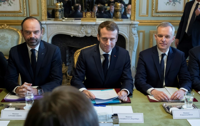 الرئيس الفرنسي ايمانويل ماكرون متوسطا رئيس الحكومة إدوار فيليب (يسار) ووزير البيئة فرنسوا دو روجي في الاليزيه قبيل عرض خطة حول الطاقة الثلاثاء 27 تشرين الثاني/نوفمبر 2018